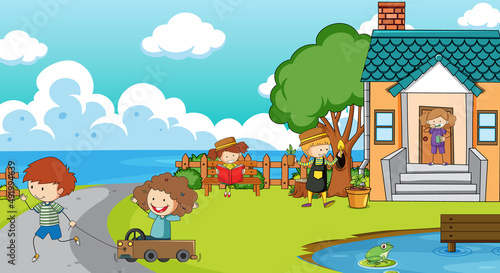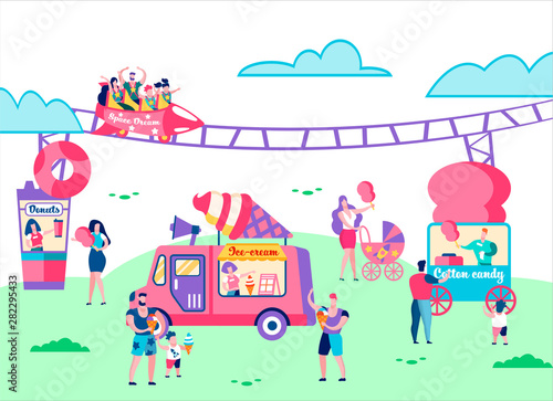 Vektorová ilustrace konceptu městského veřejného parku. Prodavač zmrzliny prodávající zmrzlinové kužely, děti si hrají míč, žena venčí psa, zametač ulic s koštětem. Plochý design.