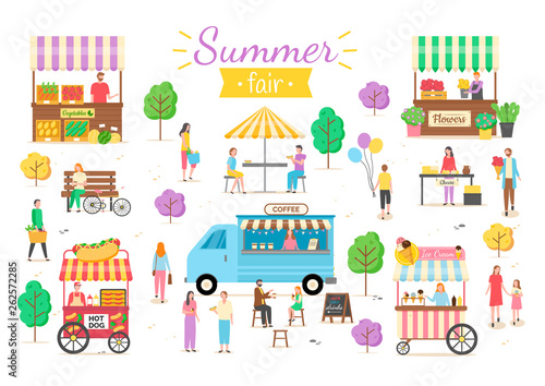 Vektorová sada prvků konceptu městské ulice. Městská ulice s taxíkem, Kavárna, park a nábřeží se zmrzlinou a kávovým kolem, lidé odpočívají, kupují jídlo. Plochý design.