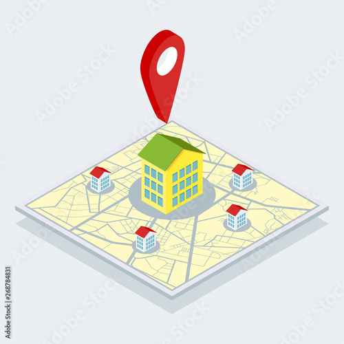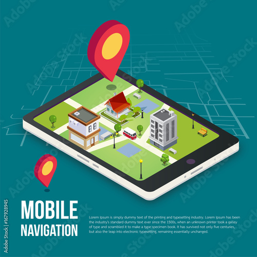 Městské taxi on-line služby vektorové koncepce ilustrace. Izometrická mapa města se žlutým taxíkem, lokalizační kolíky. Objednat taxi online, navigace mobilní aplikace.