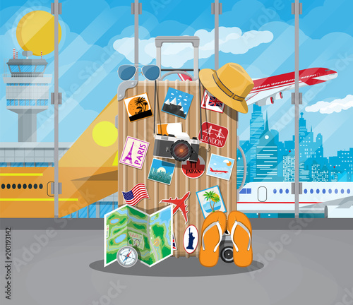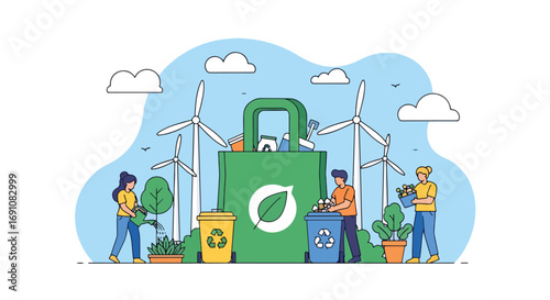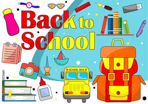 Úklidová společnost service concept vector flat ilustrace. Vysavač, upozornění mokré podlahy znamení, auto, kbelík, houba mop, kartáč čistící prostředky. Komerční a bytové úklidové služby plakát banner.