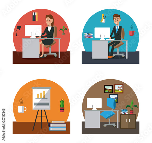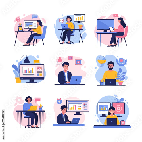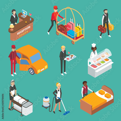 Úklidová společnost personál čistič lady, trash collector muž s úklid domu zařízení, plochý vektor izolované ilustrace. Mytí oken, praní prádla, žehlení, vysávání, sběr odpadků, mytí nádobí.