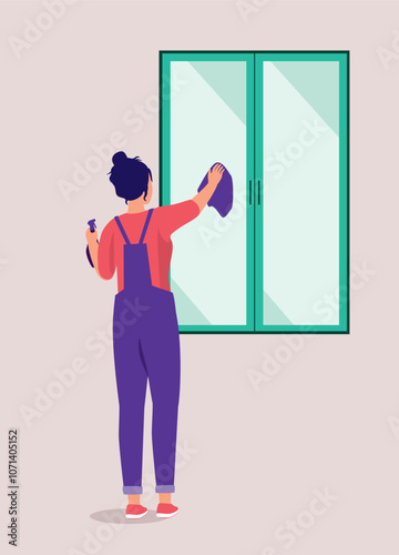 Úklidová společnost personál čistič lady, školník muž s úklid domu zařízení, vector byt izolovaný ilustrace. Čištění oken, praní, žehlení, poprašování, vysávání, sběr odpadků.