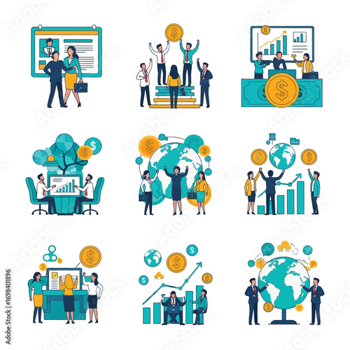 Vektorová ilustrace úklidových Dam a čistších mužů v práci. Čisticí společnost lidé symboly, ikony izolované na bílém pozadí. Plochý design.