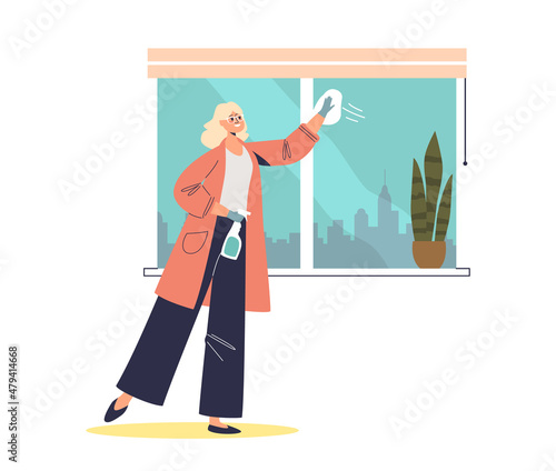 Vektorové ilustrace uklízečka mytí okna. Čištění lidí plochý styl designový prvek, ikona izolován na bílém pozadí.