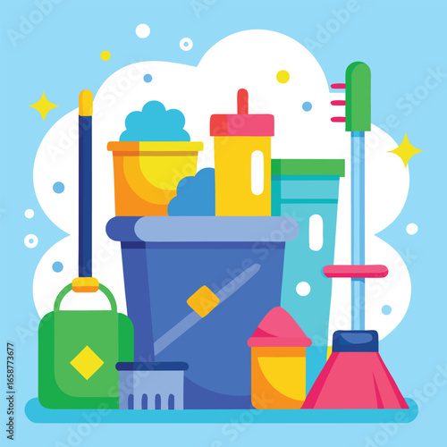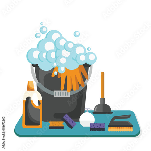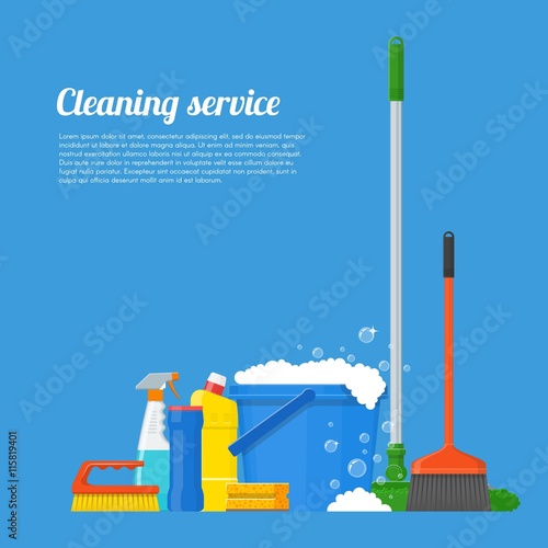 Úklidová služba společnost concept vektorové ilustrace. Nástroje pro čištění domu plakát design v plochém stylu.