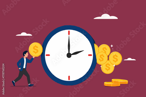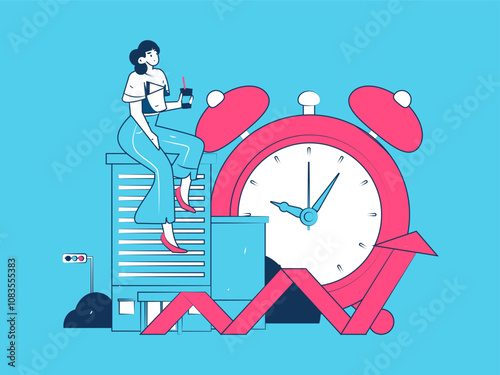 Obří hodiny, přesýpací hodiny, malé kancelářské lidi zaměstnanci běží v panice s dokumenty, ploché vektorové ilustrace. Řízení času, termín, naléhavá práce.