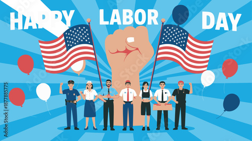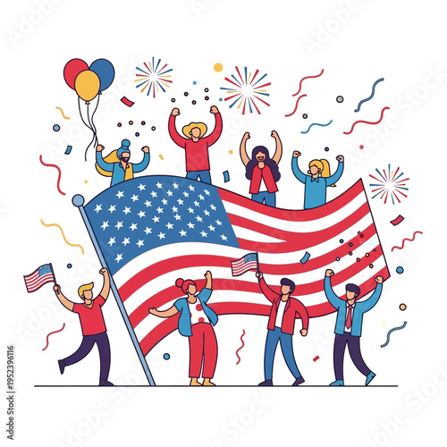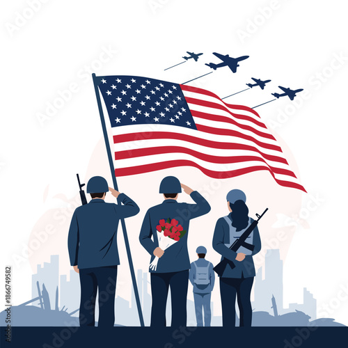 Uzavřené hranice do USA pro imigrační vektor. Lidé s taškou na zavazadla čekají na otevření cesty do Ameriky ilustrace. Vlajka pod uzavřeným kovovým řetězem a zámkem nad designem pozadí Panoráma města