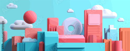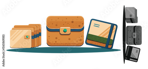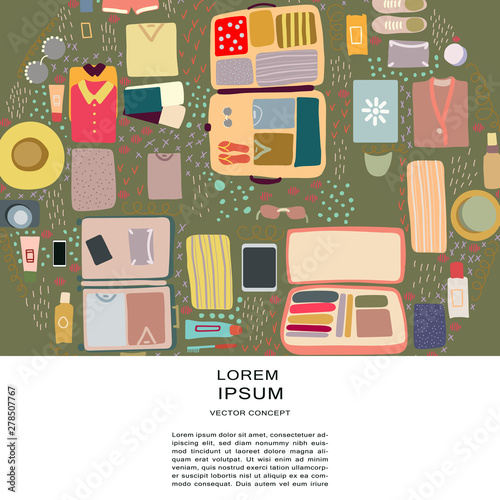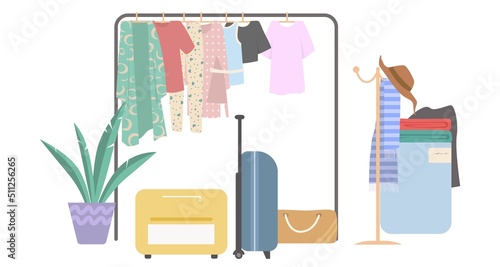Oblečení visí na stojanu s příslušenstvím vektoru. Čisté a použité oděvy, věci složené do zavazadlového kufru. Showroom garáž nebo second hand market ilustrace