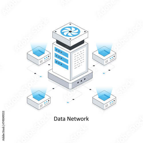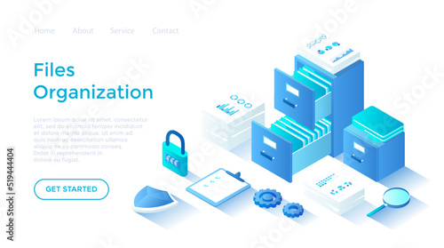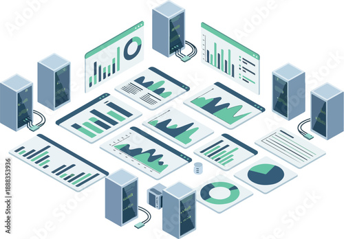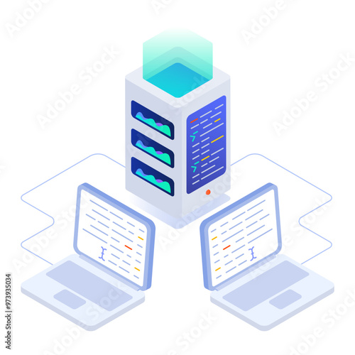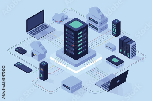 Vývojový diagram technologie Cloud computingu, izometrické vektorové ilustrace. Cloud dat hosting servery, digitální složky, notebook, stolní počítač, mobilní telefon.