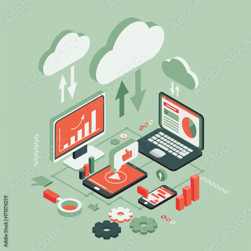 Cloud kryptoměna peněženka, ploché vektorové ilustrace. Izometrický bitcoin cloud připojený k mobilnímu telefonu, notebooku a stolním počítačům. Digitální úložiště peněz, online Peněženka na kryptoměny.