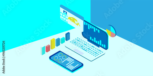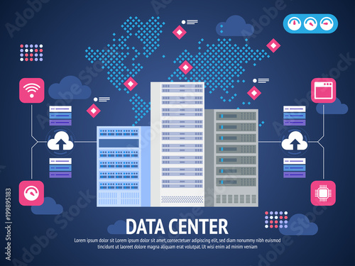 Cloud hosting vývojový diagram vektor izometrické ilustrace. Datové centrum s hostingovými serverovými stojany v cloudu propojené s notebookem.
