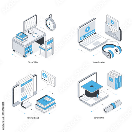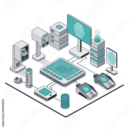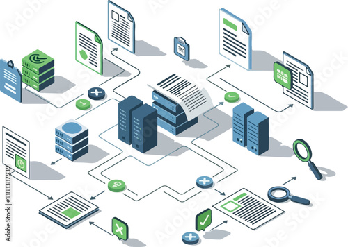 Vývojový diagram datové sítě. Vektorové ploché 3D izometrické ilustrace síťových serverů, internetového routeru, notebooku, mobilního telefonu.