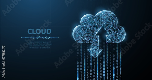 Zabezpečení dat cloud nízké poly drátěné pletivo vyrobené z bodů, čar a tvarů. Vektorové polygonální umění styl designu. Šablona banneru plakátu s kopírovacím prostorem.