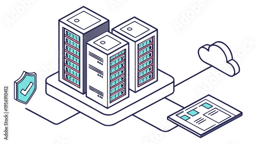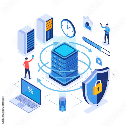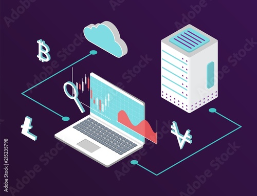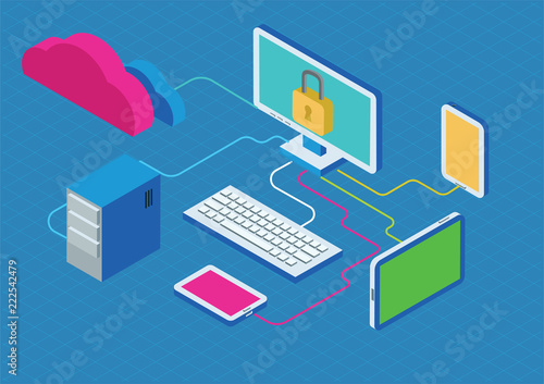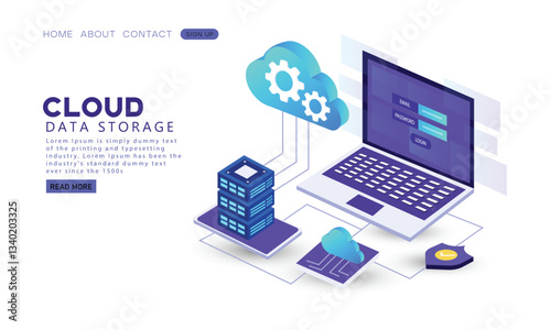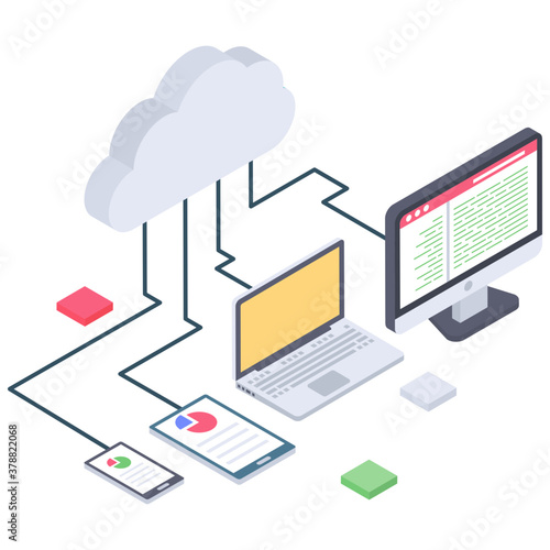 Vývojový diagram technologie cloudových služeb, izometrické vektorové ilustrace. Datové centrum se serverovými stojany, cloud, složka souborů, dokument spojený s notebookem, stolním počítačem a mobilním telefonem.