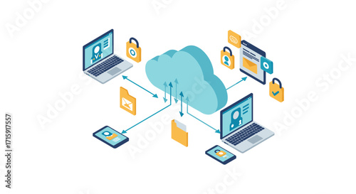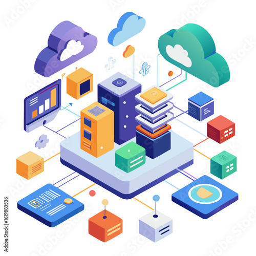 Vývojový diagram cloudových služeb. Vektorové ploché 3D izometrické ilustrace síťových serverů, internetového routeru,notebooku, mobilního telefonu atd.