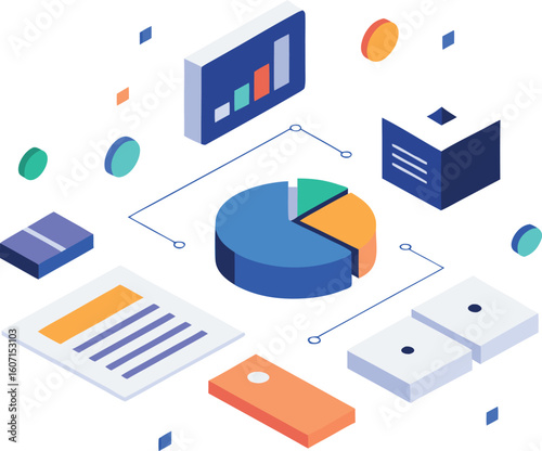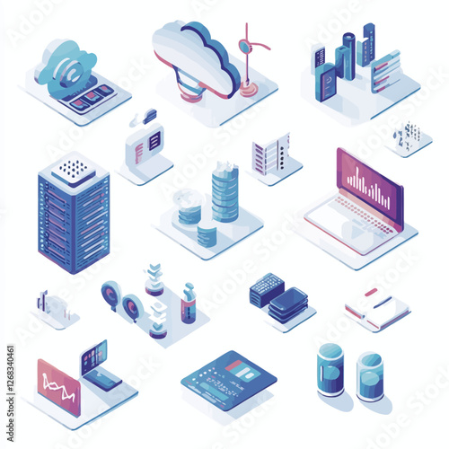 Vývojový diagram technologie cloudového úložiště, izometrické vektorové ilustrace. Ukládání počítačových dat. Cloudové synchronizační služby.
