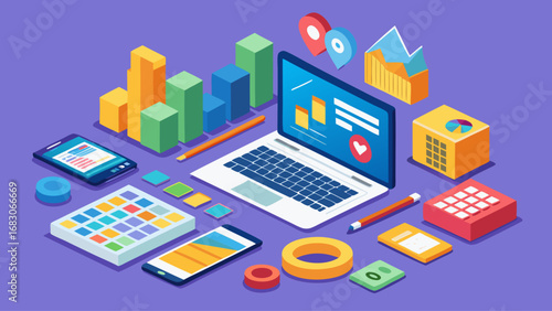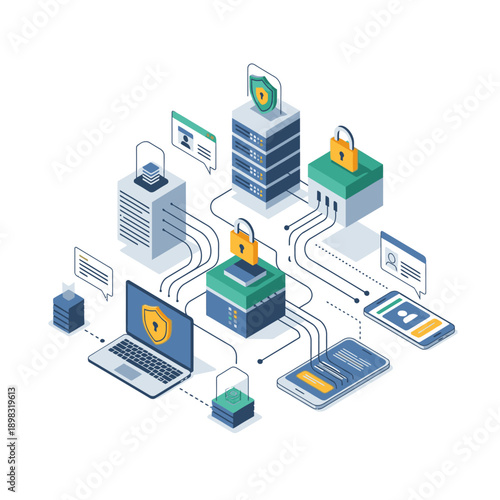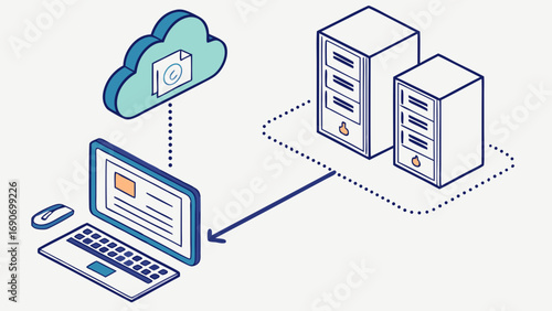 Vývojový diagram technologie Cloud computingu. Vektorové izometrické ilustrace datového centra se serverovými stojany v cloudu spojené s notebookem, stolním počítačem a smartphonem.