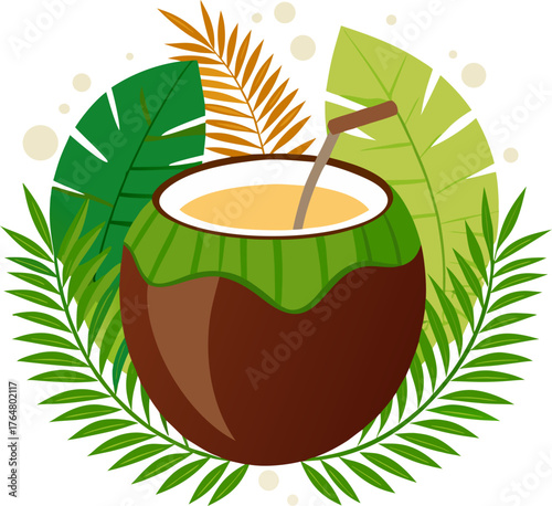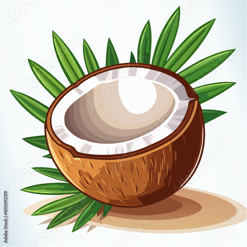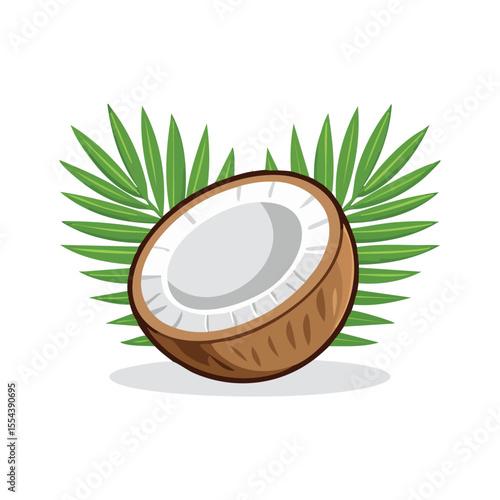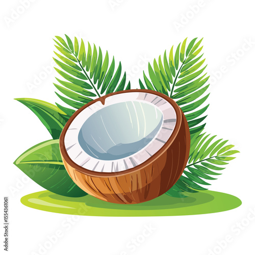 Kokos v čokoládě stříkající přes zelené palmové listy vektorové ikony. Realistický designový prvek pro dezertní výrobky izolovaných na bílém pozadí