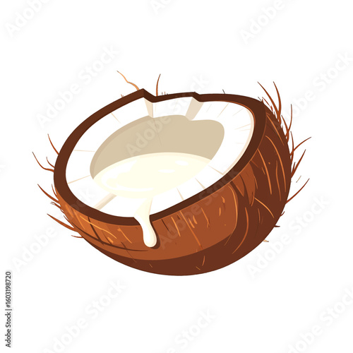 Exotické ovoce kokos a kapka splash mléka přes zelené palmy list realistické vektorové ikony. Designový prvek pro sladké výrobky izolovaných na bílém pozadí