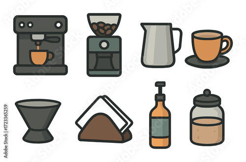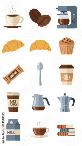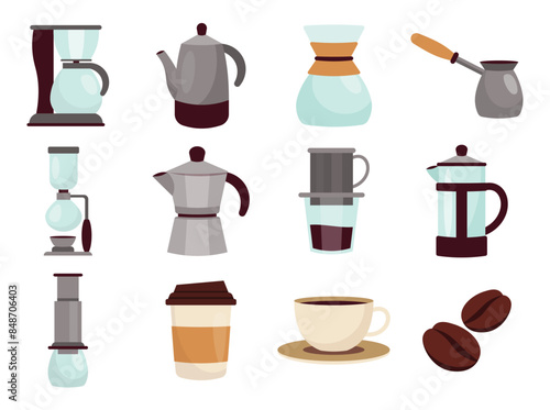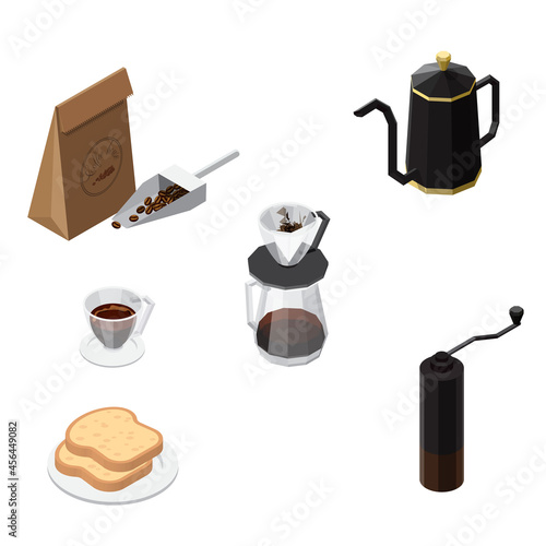 Kávový set. Vektorové pohár nebo hrnek s nápojem, croissant dezert, turecký cezve hrnec, konvice a pražené fazole obilí izometrické 3D ikona ilustrace izolovaných na bílém pozadí
