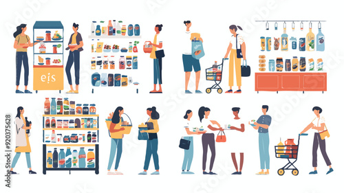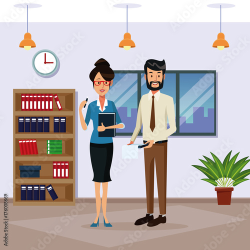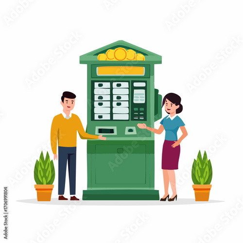 Vektorová ilustrace podnikatelů, kteří si dávají přestávku na kávu. Muž a žena stojící vedle kávovaru a prodejního nebo potravinářského stroje s plochým designem.