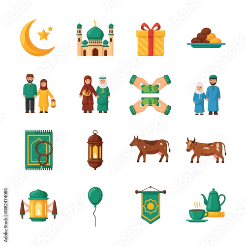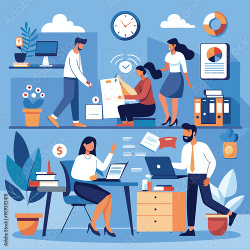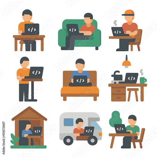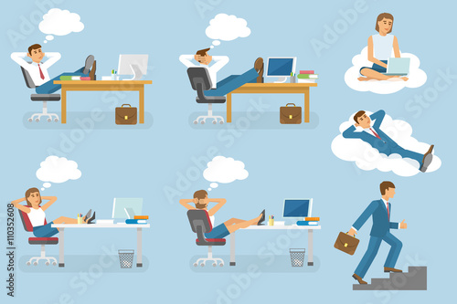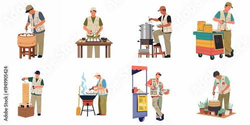 Kavárna vector icon set s pracovníky, kteří připravují kávu, číšník a servírka servírující kávu návštěvníkům, cukrář s plátkem dortu a kancelářští lidé s kávou. Ploché designové prvky.
