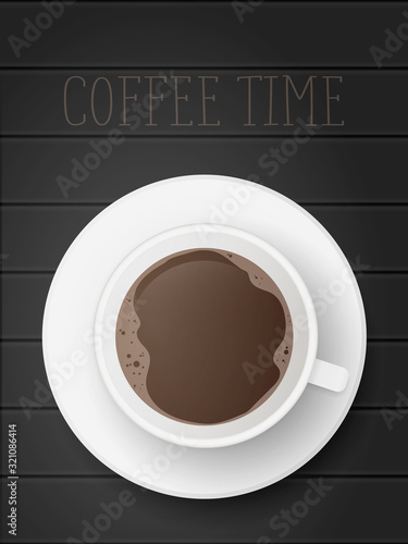Coffee power concept vektorové realistické ilustrace. Pohled shora šálek kávy na dřevěné pozadí. Plakát na kávu, šablona návrhu letáku.