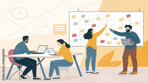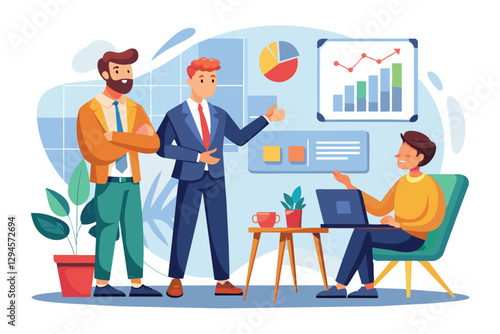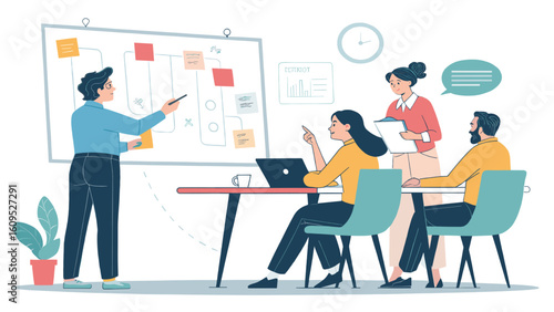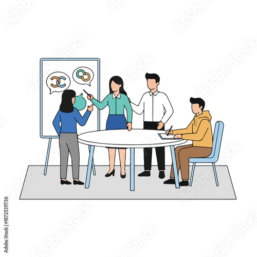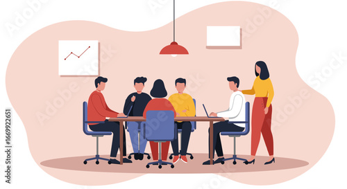 Kavárna Scéna. Lidé pijí kávu, mluví mezi sebou, diskutují o něčem, ploché vektorové ilustrace. Mladí lidé přátelé, kolegové, obchodní tým setkání. Kavárna, interiér kavárny.