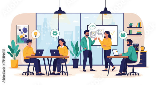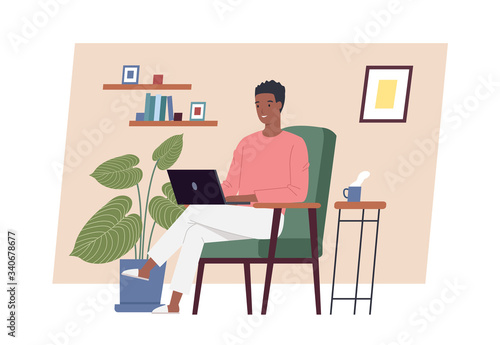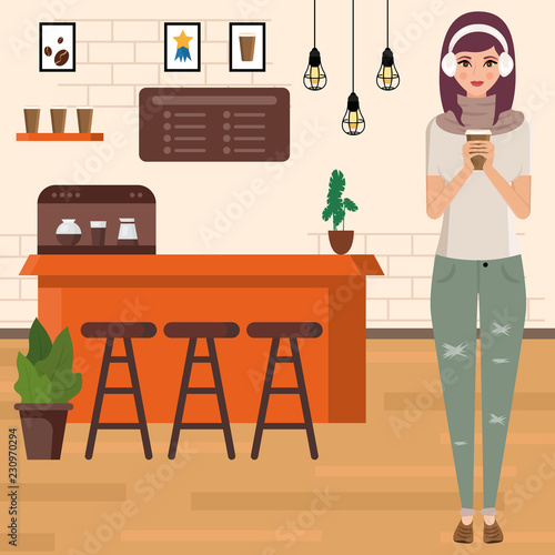 Kavárna Scéna. Šťastná žena pije kávu a pracuje na přenosném počítači, zatímco sedí u stolu, plochá vektorová ilustrace. Na volné noze, práce na dálku. Kavárna, interiér kavárny.