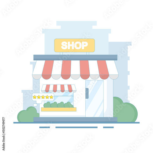 Otevření kávového pouličního trhu. Muž prodejce kreslená postavička v uniformě dělat horké aroma nápoj v šálku. Coffeehouse showcase na chodníku