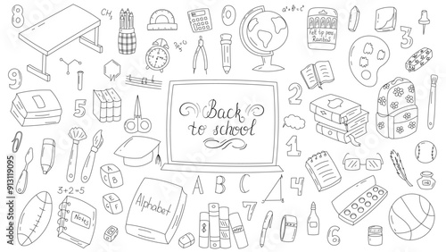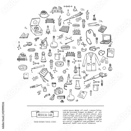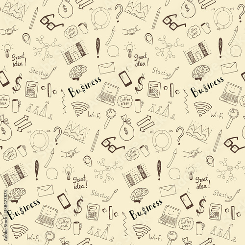 Realistický pohled shora šálek kávy proti ručně kreslené obchodní a finanční symboly pozadí, vektorové ilustrace. Coffee time plakát design šablony.