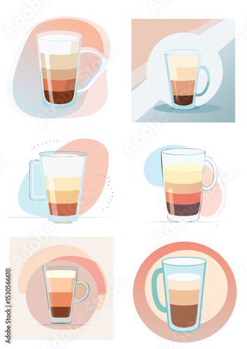 Sada typů kávy, vektorové izolované ilustrace. Typy espressa, doppio, trippio, cappuccino, frappe, americano, caramel macchiato, další kávové nápoje s názvy pro restauraci, menu kavárny atd.