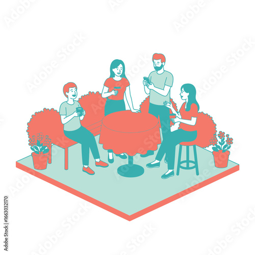Káva typografie banner šablona, vektorové ploché ilustrace. Lidé kupují horký nápoj z automatu. Barista dělá kávu pro mladého muže, lidé pijí kávu, zatímco sedí na velkých písmenech.