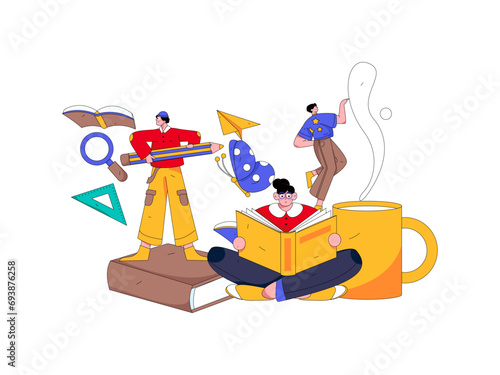 Malé postavy barista tým dělat kávu pomocí velký Kávovar, Rychlovarná konvice, lžíce, vektorové ilustrace. Kavárna, kavárna, bar nebo kavárna kompozice pro webový banner, webovou stránku atd.