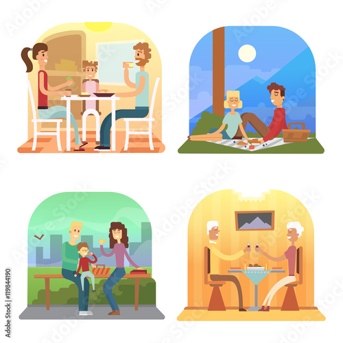 Šťastné páry pití kávy v kavárně, kavárně, restauraci, vektorové ilustrace izolovaných na bílém pozadí. Přestávka na kávu, chodit s někým koncept pro webový banner, webová stránka, plakát atd.