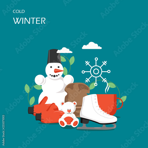 Studená zima vektorový plochý styl designu ilustrace. Sněhulák, brusle, teplý klobouk a rukavice, medvídek, šálek horkého čaje, sněhová vločka. Zimní kompozice pro webový banner, webovou stránku atd.