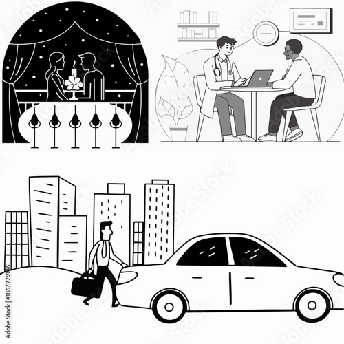 Sada čtyř odznaků city taxi. Abstraktní auto s řidičem, tradiční taxislužba, ukázkový text. Grafické vintage styl vektorové ilustrace.