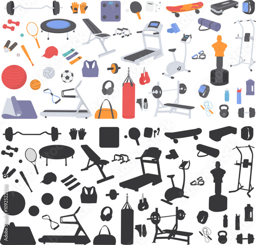 Barevné hudební nástroje a noty silueta vektorové ilustrace set. Kolekce různých orchestrálních zařízení v plochém stylu