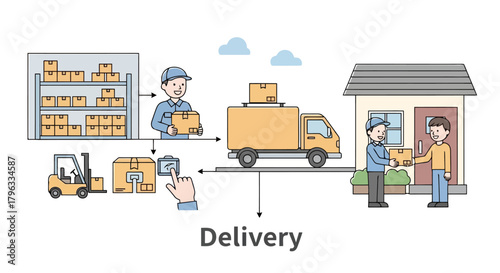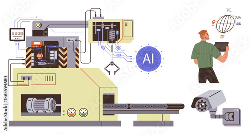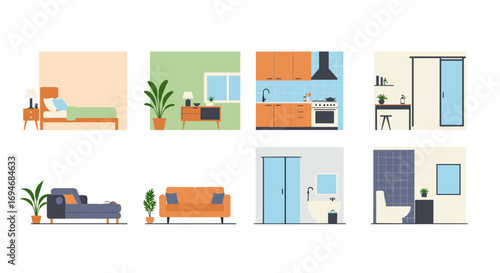 Komerční kuchyňská scéna, plochý vektorový izolovaný obrázek. Kuchař vaření jídla, cukrář dělat dezerty, číšník servírování jídel. Restaurace podnikání a stravování.