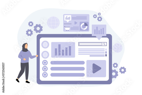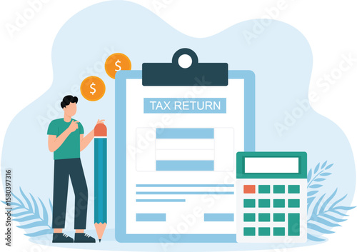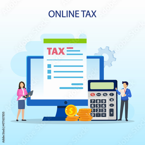 Firemní rozpočet vektor plochý styl designu ilustrace. Koncepce procesu rozpočtování a obchodního plánování s velkou prasátko, kalkulačkou, malými lidmi, kteří dělají finanční výpočty pro webový banner, webovou stránku.