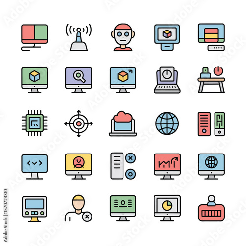 Vektorový bezproblémový vzor s počítačovými programovacími symboly, ikonami. Program kódování pozadí, balicí papír textura tenká čára umění plochý styl designu.