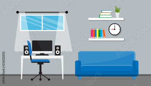 Obrazovka počítače s webovými okny, sociálními médii a symboly digitální komunikace. 3D vykreslení vektorové ilustrace. Kancelářský stůl render, počítač, klávesnice, lampa. Online vyhledávání.