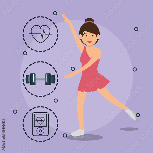 Vektorová koncepce ilustrace rytmické a umělecké gymnastiky. Designové prvky a ikony v plochém designu. Gymnastka se sportovním vybavením, obruč, kluby, koule, stuha, hlavice, křída a bar