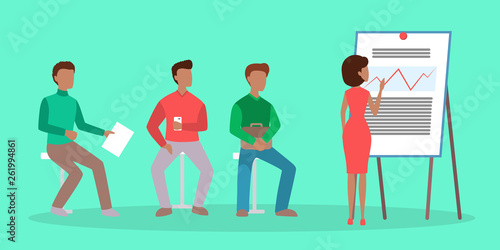 Šťastné týmové postavy při pohledu na sebevědomou úspěšnou obchodní ženu, která chodí po laně, plochá vektorová ilustrace. Peníze, žárovky obchodní symboly. Příjem, zisk, inovace, riziko.