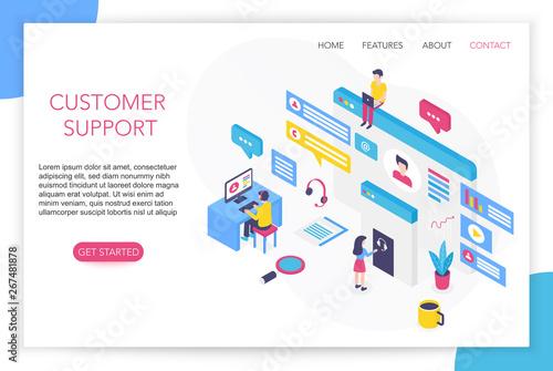 Kontaktujte nás stránku. Call centrum a podpora on-line chatu koncept ilustrace. Lidé odpovídají na hovory a dotazy zákazníků. Vektor web design šablony.