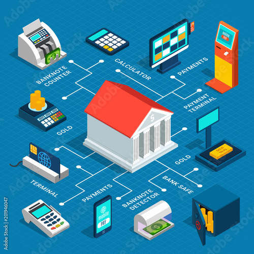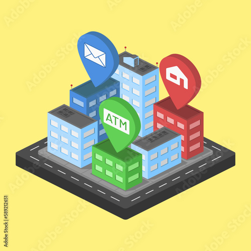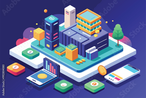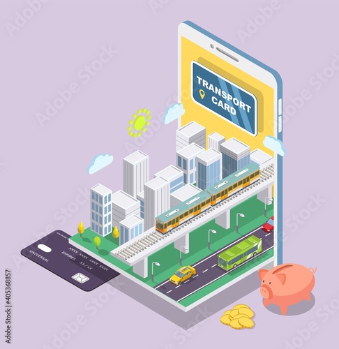 Izometrická karta veřejné dopravy, městské budovy, autobus, vlak metra, smartphone, ploché vektorové ilustrace. Elektronická platba jízdenek. Bezkontaktní technologie čipových karet.