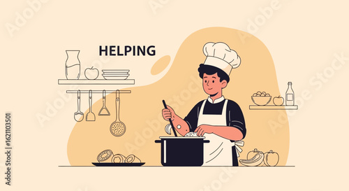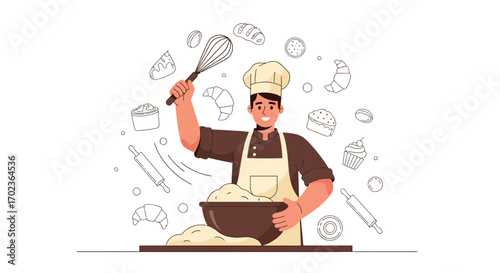 Vektorová ilustrace kuchaře, který drží kuchyňský nůž a vidličku připravenou k řezání a podávání jídla s ohněm. Cook lidé koncept plochý styl designový prvek, ikona izolován na bílém pozadí.