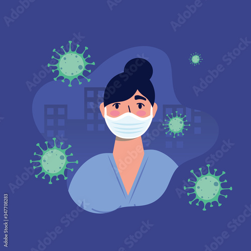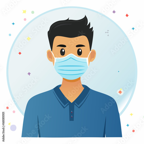Muž na sobě ochrannou lékařskou masku a rukavice, vektorová plochá ilustrace. Pozadí mapy šíření koronaviru. Boj proti koronovému viru Covid-19, prevenci a ochraně koronavirů.
