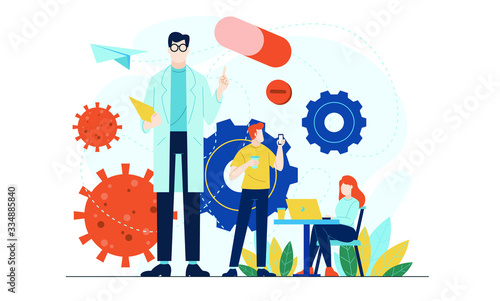 Coronavirus testovací laboratoř, koncept vektorové ilustrace. Vědci a lékaři používají mikroskop v laboratoři. Výzkum vakcíny Covid. Corona virus spike protein tvar.