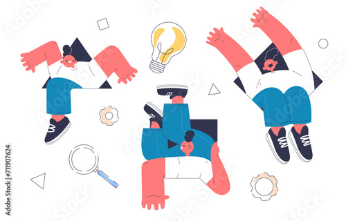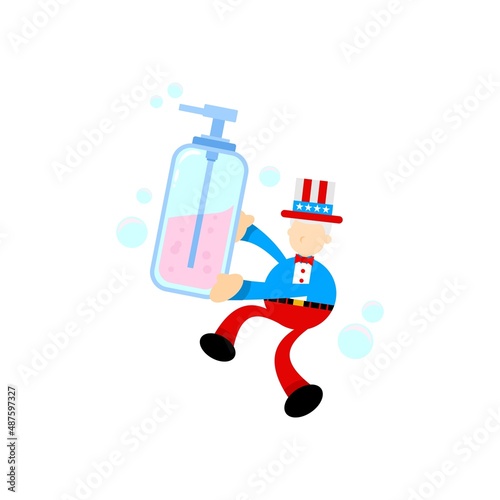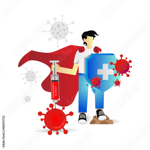 Lahvičky s vakcínou Covid-19, doktor drží deštník stříkačky, který ho chrání před koronovými viry řezanými papírem, vektorové ilustrace. Očkování. Prevence šíření koronaviru.